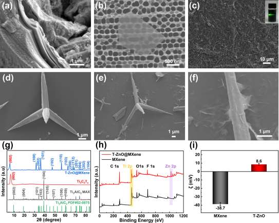 通过SEM、XRD、XPS及zeta电位等表征方法证明T-ZnO@MXene杂化材料成功制备且结构稳定:刻蚀剥离获得超薄层状Ti₃C₂Tₓ MXene纳米片,分散液兼具成膜性与丁达尔效应,胶体稳定性优异;T-ZnO晶须形貌规整,其3D结构为MXene负载提供理想基底,MXene可均匀包覆于T-ZnO表面形成复合结构。XRD证实MAX相成功转化为MXene,层间距增大且杂化材料无杂峰、无相变;XPS检测到Zn 2p与Ti 2p特征峰,印证复合结构形成;MXene(-38.7 mV)与T-ZnO(+8.6 mV)相反的表面电荷,为静电自组装形成稳定异质结构提供基础。