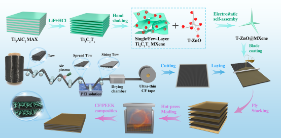 研究团队依托前期研究基础,开展一系列工作,完整构建了结构-功能一体化CF/T-ZnO@MXene/PEEK复合材料: