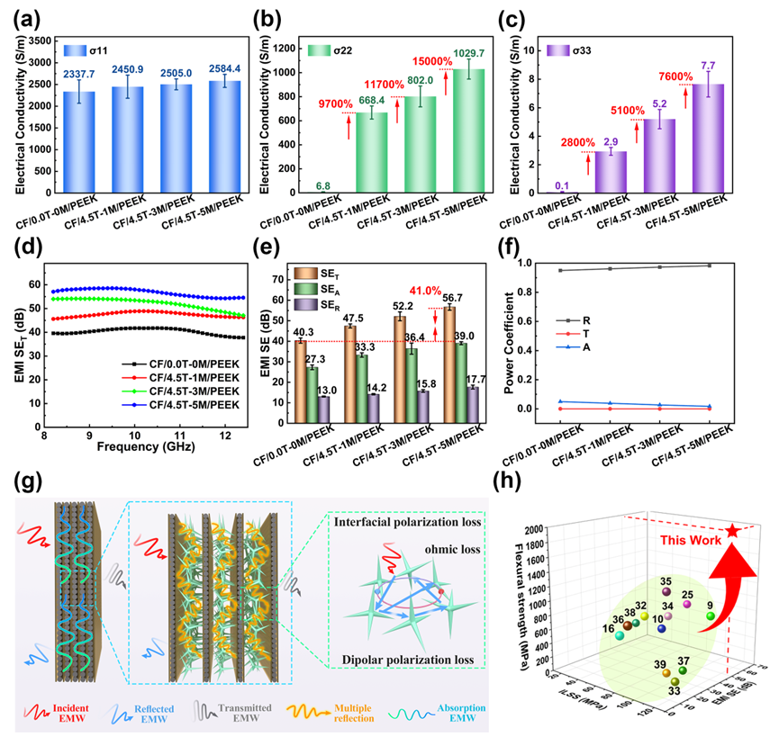T-ZnO@MXene的引入提升了CF/PEEK复合材料的导电性,纵向导电性小幅提升10.6%,横向、厚度方向导电性则分别实现150倍、76倍大幅增长,这源于T-ZnO@MXene构建的3D连续导电网络。在雷达、卫星通信等核心的X波段(8.2-12.4 GHz),改性后复合材料EMI屏蔽效能显著提升,CF/4.5T-5M/PEEK的屏蔽效能达56.7 dB,较未改性样品提升40.7%,远超商用标准(20 dB)、接近军用要求(60 dB),可屏蔽99.999%的入射电磁波。其屏蔽遵循“表面反射+内部吸收”协同机制,T-ZnO的四针状结构形成“3D纳米网络”,进一步强化电磁波能量耗散。我们将其与已报道的CF/PEEK复合材料在弯曲强度、层间剪切强度(ILSS)和EMI屏蔽效能(SE)方面进行对比。结果表明,这种结构-功能一体化复合材料可同时展现卓越的力学性能与EMI屏蔽性能,其弯曲强度、ILSS和EMI SE分别达到1970.3 MPa、123.2 MPa和52.2 dB,各项性能指标均优于多数已报道同类材料,具备显著竞争力,可广泛应用于航空航天、高端装备制造等领域,为先进工程结构件的轻量化、多功能化发展提供了全新解决方案,具有重要的工业应用价值。