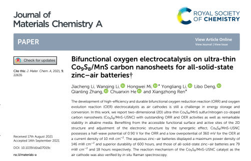 题为《Bifunctional oxygen electrocatalysis on ultra-thin Co9S8/MnS carbon nanosheets for all-solid-state zinc-air batteries》的论文由研究生李嘉成为第一作者,任祥忠教授和米宏伟副教授为共同通讯作者。深圳大学为唯一单位和唯一通讯单位。