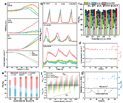 利用蒸镀策略首先在Cu催化剂层表面构建孤立的Au位点,以增强Cu催化剂的本征活性;然后通过Au-S键将己硫醇(HEX)分子固定在Au位点上,以调节反应微环境。Au/Cu双金属活性位点降低了C-C偶联过程的能垒,加速了多碳产物的生成。Au位点上稳定且非致密的HEX分子修饰层,可以保证催化界面的疏水性,同时确保反应物与*CO关键中间体的传输通道。因此,该催化剂即使在安培级电流密度下,多碳产物的法拉第效率也能达到70%以上,且能保持长时间的稳定性(图4)。