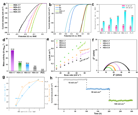 利用MOFs和聚合物纤维的限域效应,成功合成尺寸可调的高熵纳米合金,实验室条件下可一次性制备约400 cm2。HEA纳米颗粒均匀限域在多级孔碳纤维载体上,其平均直径为1.7、2.3、3.0和3.9 nm。较小的HEA纳米颗粒具有较低的功函,促进电子从催化材料表面转移到反应中间体,加快整体反应动力学。此外,其多级孔碳纤维载体,可以暴露更多的活性位点,大大提高贵金属的质量活性(图2)。