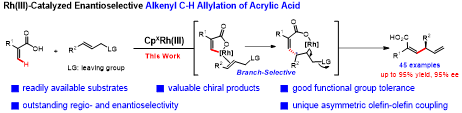 王守国团队在国际顶级期刊《Journal of the American Chemical Society》(影响因子15.6,中科院JCR 1区TOP,Nature Index期刊)上发表题为《Direct Catalytic Enantioselective C(sp2)–H Allylation of Acrylic Acids: Modular Access to Chiral 1,4-Skipped Dienes》的研究论文,报道了一例手性 CpxRhIII催化的丙烯酸直接不对称烯基 C(sp2)–H 烯丙基化反应,实现了丙烯酸与烯丙醇酯之间的高效、不对称交叉偶联,为手性 1,4-跳烯二烯结构的模块化合成提供了一条全新的策略。
