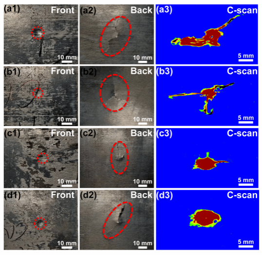 图4 CF/PEEK复合材料落锤冲击后的前后面损伤数码照片与超声C扫照片