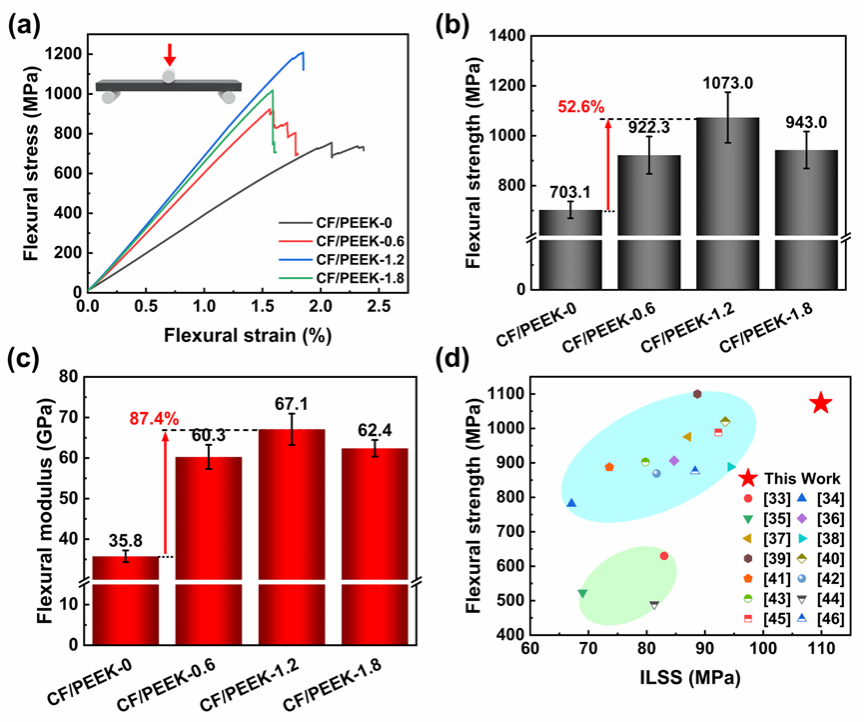 面内力学性能的显著提升直观验证了梯度模量界面层的增强效果:图2实验结果显示,优化后的CF/PEEK-1.2复合材料的弯曲强度达到1073.0 MPa,弯曲模量达到67.1 GPa,较未改性组分别大幅提升了52.6%和87.4%。该研究所取得的层间剪切强度(ILSS:109.9 MPa)与弯曲强度均优于目前文献报道的绝大多数同类研究成果。