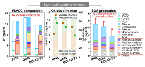轻型汽油车排放的中等挥发性(IVOCs)与半挥发性有机物(SVOCs)是大气二次有机气溶胶(SOA)生成的关键前体物,正成为大气污染防控的新焦点。然而,发动机类型与后处理技术的发展对汽油车I/SVOCs排放特征的影响未被充分解析。本研究结果表明,含氧化合物(主要为酸类和羰基类)占气态I/SVOCs总排放因子的40.5-58.5%。安装汽油颗粒过滤器反而增加了含苯环的羰基类物质的排放,揭示了机动车后处理装置的潜在氧化效应。本研究通过将含氧IVOCs纳入排放源谱,修正了空气质量模型中IVOCs在气态总有机物中的比例,并使SOA生成的模拟偏差缩小了47.1%。该成果明确了IVOCs在机动车排放控制策略中的优先地位,并且为空气质量模型提升精度提供了新思路。